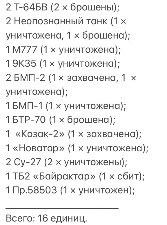 Статистика потерь техники ВСУ «за вчера»: https://vk.com/wall-93248495_238140