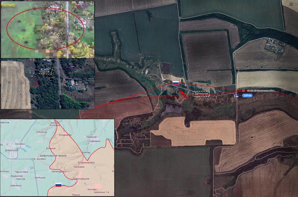 23.10.25 Красноармейск - Суворово(Затышок) Позиционные боевые действия в районе Красноармейска. Передовая позиция ВС РФ в населённом пункте Суворово подверглась обстрелу ВСУ. ВС РФ заняли новые позиции в западной части населённого пункта после продвижения более 1 км по жилой застройке.