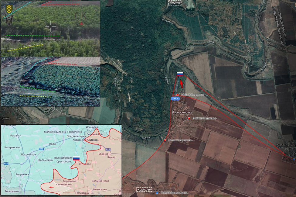23.10.25 Покровское - Новосёловка Позиционные боевые действия в Днепропетровской зоне безопасности. Позиция ВС РФ по восточному берегу реки Волчья около Новосёловки под огнём ВСУ. Уточнение линии боевого соприкосновения по архивным кадрам. Увеличена зона контроля ВС РФ в Днепропетровской области.