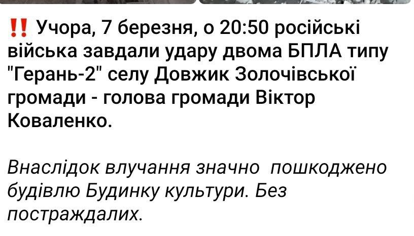 ID: 69409 | Автор: Артем | Дата: 2026-03-08 | Просмотров: 183 | Теги: Поражение объектов, Герань, ПВД, уничтожен, _последствия, Довжик, _Харькобл, _25,5км, без_видео