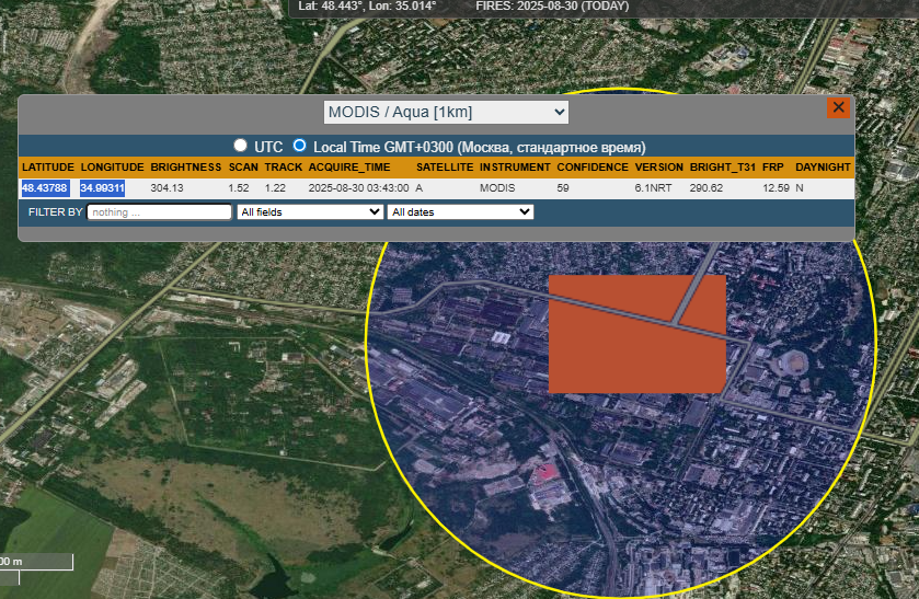 Подтверждено поражение одного из объектов в ночь на 30 августа 2025 года Днепропетровского ракетно-космического кластера — корпуса № 55 КБ «Южное», расположенного у восточной проходной предприятия.