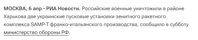 Источник: https://t.me/infomil_live/5468 https://t.me/voenacher/63773?single Видео удара по РСЗО: https://lostarmour.info/news/destroyed-2-mlrs-uragan-udarom-otrk-vysokogovorit-24-04-06 160 зенитно-ракетная бригада