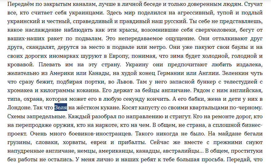 Кроме этого, необходимы максимальные усилия для создания условий повсеместного прихода к управлению районами, городами и областями агрессивных идиотов, инициативных дураков и простых мерзавцев, презирающих неворующих, а потому решительно настроенных стремительно обратить всюду в прах устои права, правосудие и законность. Поэтому необходимо украинскую правовую машину сперва подавить, чтобы вам самим не угодить под ее колеса, а затем подчинить нашим целям устранения неугодных, препятствующих окончательному «реформированию». Дабы они не мешали специально отобранной нами разной бездарной мрази в этой веренице плутовато-вороватых бездарей, озаренных лишь вспышкой сумасшедшего карьеризма, возвыситься из безвестности на первые посты в разрушаемом государстве и разорить его дотла. Учитывая, что честность не является природным свойством человека, а на ее воспитание уходят долгие годы, усилия и искусственные средства, ваши «свидомиты» успеют украинскую госказну мигом растащить и превратить в кучу, засиженную тучей новоиспеченных взяточников. Эти ребята своей вороватой бездарностью быстро покроют Украину кровью и развалинами, что им и поручается. Для ускорения всего процесса требуется как можно быстрее порушить старые институты власти и издать за год всяких противоречивых указов-распоряжений, приказов больше, чем, скажем, было собрано в период царствования императора Юстиниана. Такое скороспелое законотворчество нужно осуществлять под сурдинку СМИ о том, что, мол, именно недостаток новых законов мешает украинцам быть счастливыми, для чего всячески подстрекать «депутатов» вредоносить за счет злоупотребления своей законодательной властью. Этого не мудрено добиться, учитывая, что теперешние нравы, избранные по нашей схеме на основе только лишь одного территориального принципа, мнением подавляющего большинства депутатов отражают бестолковую посредственность толпы, из которой возникли, и поэтому обречены, ибо не способны умело повелевать. Они натолкнутся на полное неповиновение, считая его круговым предательством, а потому вместо дела станут шарахаться в разные стороны, непримиримо-злобно склочничать меж собой, пережевывая туманные и множественные идеи. Примирившись со своей беспомощностью, они примутся просто говорить, вместо того чтобы действовать. Вам, господин Коломойский, нужно задавать всюду тон бесталанного пустого краснобайства, ибо талантливость способна внести ясность, что для нашего общего дела чрезвычайно вредно. Надо отметить как положительное явление: многие «депутаты-словоблуды» уже наловчились говорить так, чтобы ничего толком не сказать, поэтому те, кто поумнее, для поддержания общих иллюзий будут вынуждены лгать более изобретательно и больше других, пока не заткнутся под бременем всеобщего подозрения. Таким образом, самые умные станут самыми презренными. А если же среди них подвернутся достаточно умелые, чтобы попытаться спасти украинский народ, то их умение все равно не поможет, так как наши друзья и ваши «соратники» не оставят им времени, которое, несомненно, является канвой всех великих предприятий.