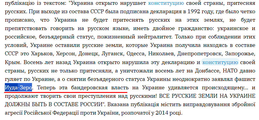 https://verdictum.ligazakon.net/document/118221525?q= https://verdictum.ligazakon.net/document/121333996?q= https://verdictum.ligazakon.net/document/129850307?q= https://verdictum.ligazakon.net/document/110458678?q= https://verdictum.ligazakon.net/document/130589982?q https://verdictum.ligazakon.net/document/125149233?q= Завершение вооруженными силами РФ, ДНР и ЛНР спецоперации в этой стране станет не только победой над киевским режимом, но и смешает карты глобалистам и Соросу, которые десятилетиями делали из бывшей советской республики плацдарм для схватки со своим главным врагом, не вписывающимся в "новый мировой порядок" Россией. Джордж Сорос никогда и не скрывал, что "его главный враг сидит в Москве": "Я считаю, что европейское общество реагирует на Россию недостаточно остро. Поэтому и пытаюсь объяснить, какую опасность она в действительности представляет". Разумеется, Россия с ее консерватизмом и верностью традиционным ценностям представляет для устроителей "нового мирового порядка" серьезную угрозу. Помните, что сказал Збигнев Бжезинский бывшему советнику по делам национальной безопасности 39-го президента США Джимми Картеру: "Новый мировой порядок при гегемонии США создается против России, за счет России и на обломках России. Украина для нас это форпост Запада против восстановления Советского Союза". "После победы над коммунизмом нам нужен раскол православия и распад России, и поможет нам в этом Украина, где предательство является нормой общественной морали" эту цитату тоже приписывают ОСОБА_16, причем сами украинцы… Можно спорить об авторстве цитаты, но не об её смысле. Ведь предатели становились правителями Украины вообще с момента появления такого названия как " ІНФОРМАЦІЯ_5 ". Одним из первых новых сторонников государства Украина стал ОСОБА_17 (ОСОБА_18), основатель фонда "Возрождение" в 1990 году. И каждый новый президент ОСОБА_19, под влиянием этого фонда и его основателя становился предателем своего народа. А вот что заявил ОСОБА_20 в 2019 году в интервью Gardian, что из всех своих проектов больше всего гордится прогрессом, достигнутым на Украине судя по всему, Сорос говорит о проектах по уничтожению стран и их населения, потому что иного прогресса на Украине не наблюдается.… Беседа происходила три года назад, задолго до начала спецоперации России, поэтому не вызвала широкого резонанса в обществе. Но уже тогда главный спонсор цветных революций намекнул, что добился в незалежной еще не полного, но "многообещающего политического прогресса". Итоги его "политических прогрессов" мы хорошо видим и на примере других стран. На деньги "кровавого инвестора" спонсировалась югославская оппозиционная партия "Отпор", которая устроила травлю Слободана Милошевича; "Оранжевая революция" и Евромайдан на Украине, "революция роз" в Грузии. Британский политик Найджел Фарадж назвал Сороса "главной опасностью для всего западного мира", а президент Турции обвинил миллиардера в попытках уничтожения и разделения наций. И хотя Зеленскому кажется, что именно он хозяин Украины, все совсем не так… хозяином Украины сегодня является "мумия" мирового финансового спекулянта в лице Сороса, который в Украине контролирует все от бюджета до правительства, от законодательных актов, которые принимает новая рада, до СМИ, регулярно промывающих мозги украинцам. Именно Сорос является локомотивом реформ, которые пытаются проводить украинские власти с 2014 года. Это и неудивительно, ведь Сорос и его приятели и