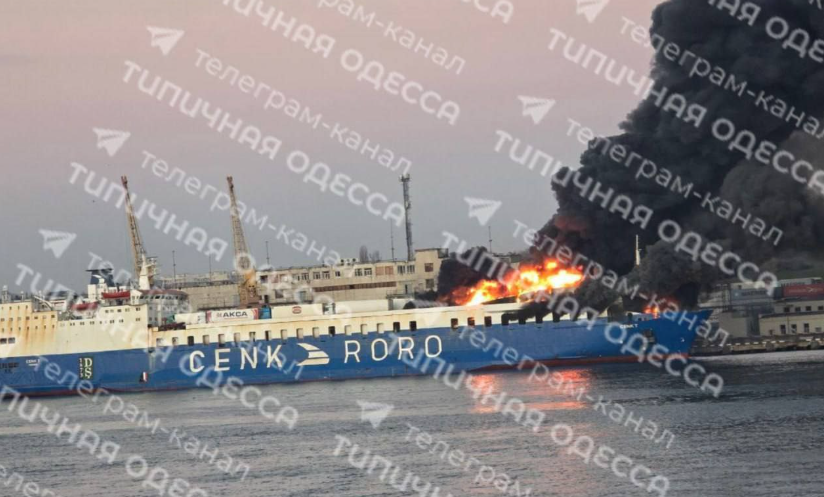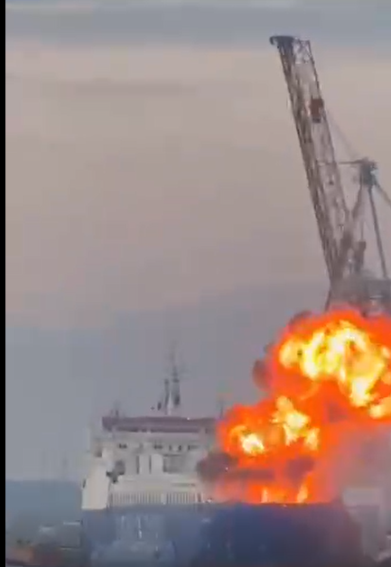 Выгорают фуры с грузом на пароме на палубе и среднем уровне. И контейнеры фирмы – поставщика генераторов бензиновых и дизельных ) Фото горящего судна в Одессе https://t.me/geranium_chronicles/48141