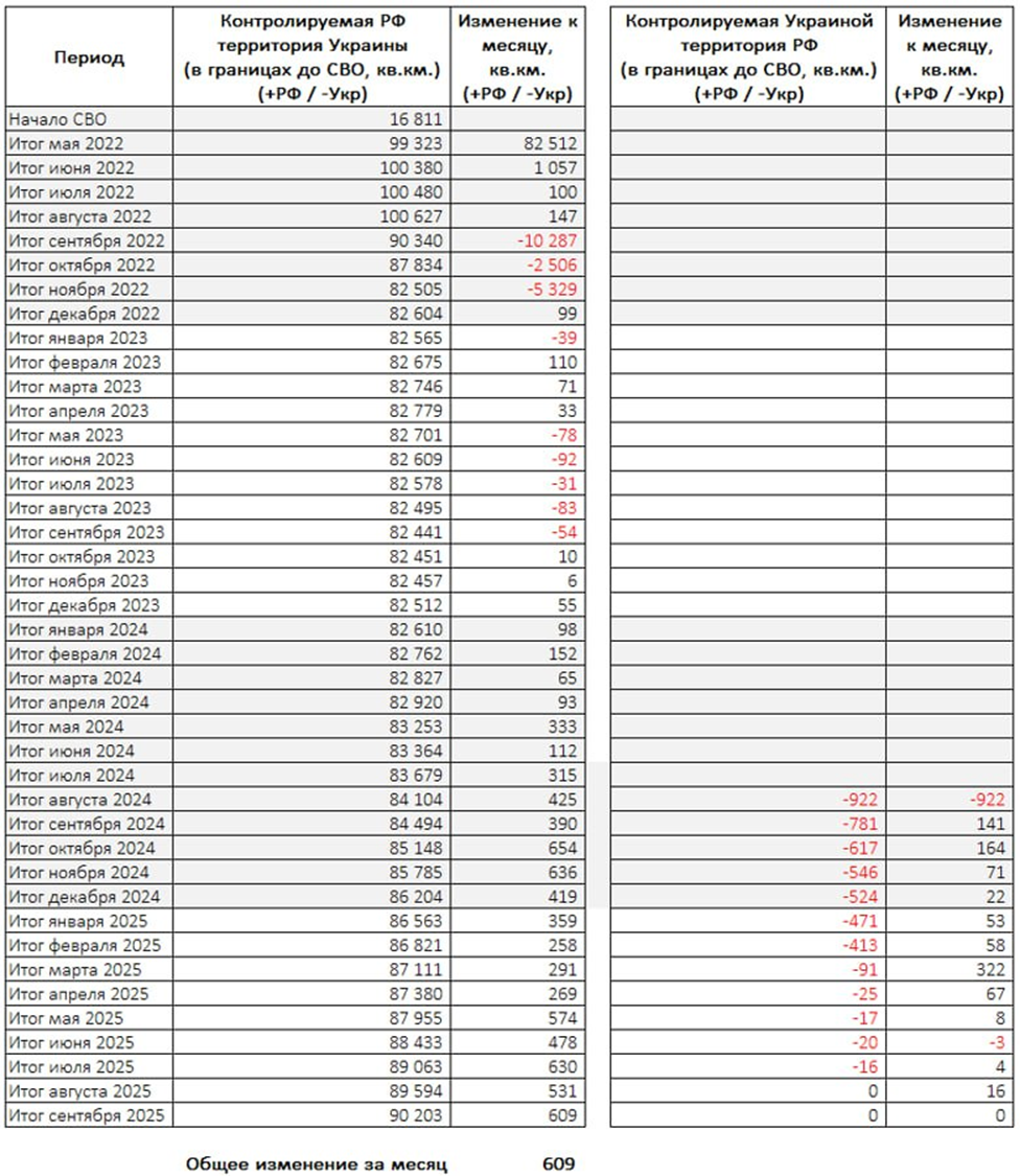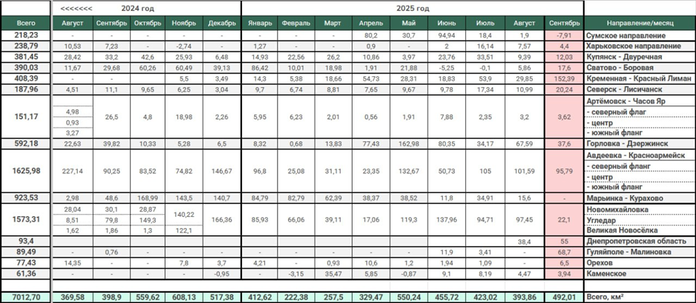 Сводная таблица территориальных изменений на карте Война за раздел Украины связанных с ведением боевых действий в зоне СВО за сентябрь 2025. Площадь контролируемая ВС РФ в зоне проведения СВО в сентябре 2025 увеличилась на 492,01 км² с темпом продвижения +16,4 км² в среднем за сутки.