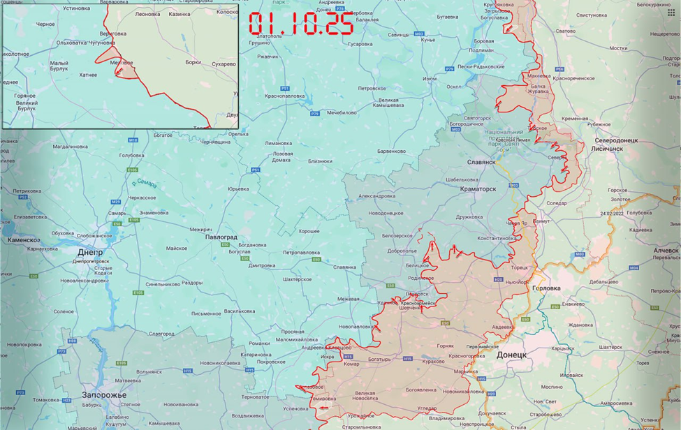 1.10.25 Сводка. Боевые действия с 27 по 30 сентября 2025 года. В Харьковской зоне безопасности ВС РФ атаковали позиции ВСУ и продвинулись в направлении Амбарного. На Купянском направлении ВС РФ заняли опорный пункт на окраинах Боровской Андреевки. В районе Красного Лимана ВС РФ подняли флаги в центральной части жилой застройки Шандриголово и в южной части Кировска. Продолжаются боевые действия в Ямполе за контроль жилой застройки на севере населённого пункта. Около Северска ВС РФ увеличили зону контроля на Руднике и штурмовали опорный пункт севернее Выемки. На восточном охвате Красноармейска ВС РФ продвинулись вдоль речки Полтавка и заняли новые позиции в Кучеров Яре. Отмечается боевая активность с присутствием сторон около Дорожного. На южном охвате Красноармейска имеется продвижение ВС РФ вдоль автотрассы на Донецк, в окрестностях Котлино и западнее Котляровки. В Днепропетровской зоне безопасности под контроль ВС РФ перешли восточная и центральная части населённого пункта Вербовое. В Запорожской области около Гуляйполя ВС РФ заняли новые позиции на рубеже Новоивановка - Ольговское.