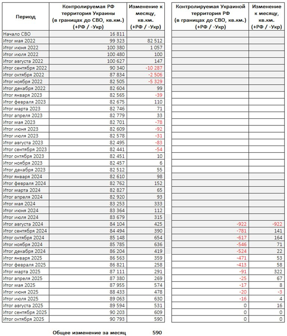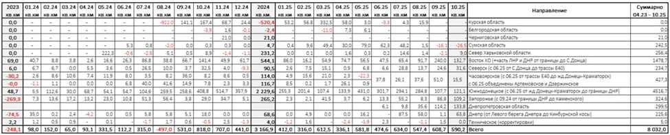 Картографические итоги октября 2025 в зоне СВО. • Общее изменение +590 км². • Основное продвижение впервые дало Днепропетровское направление - 134 км². • Очень близко к нему «Восток ХО (Харьковской области)» (включая часть ЛНР и ДНР вдоль Северского донца) – 133 км². • На третьем месте (также очень близко) Южнодонецкое направление – 121 км². • Отметим также и Запорожское направление - 109 км² • В итоге впервые четыре направления преодолели рубеж продвижения в 100 км² за месяц.