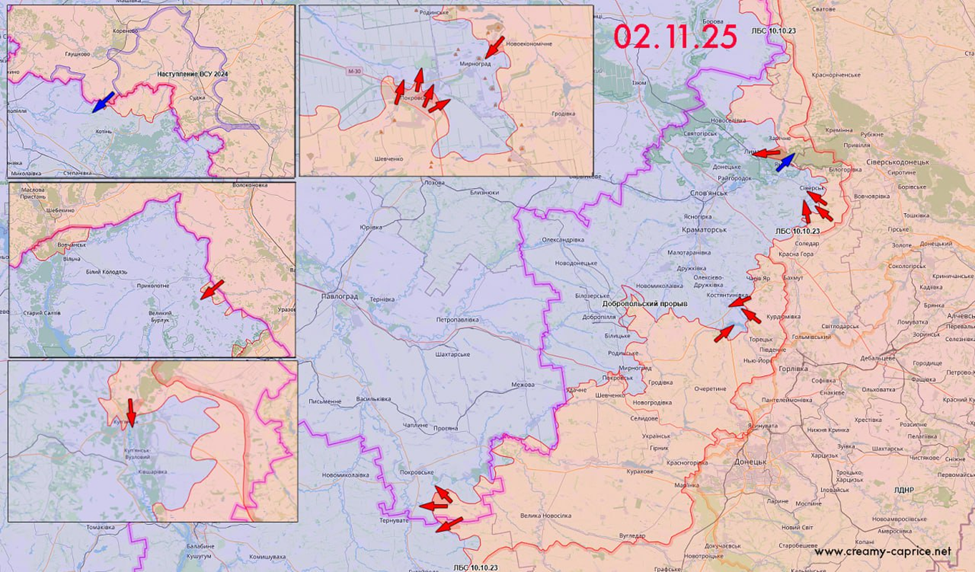 02.11.25 Сводка. Боевые действия с 29 по 01 ноября 2025 года. В Сумской зоне безопасности ВСУ провели пехотную атаку в направлении населённого пункта Константиновка. В Харьковской зоне безопасности ВС РФ увеличили зону контроля севернее Амбарного. В Купянске ВС РФ провинулись на севере левобережной части города. На Краснолиманском направлении штурмовые подразделения ВС РФ достигли города и вошли в район Масляковка. Утрачена часть позиций на севере Ямполя. Около Северска ВС РФ ведут боевые действия в жилой застройке Звановки и заняли новые позиции около железнодорожного моста через реку Сухая Плотва. Отмечается продвижение западнее Выемки. В Константиновке увеличена зона контроля ВС РФ в районе Старая Деревня и вдоль железной дороги на Горловку. Идут бои за контроль плацдарма южнее Клебан-Быкского водохранилища. В Красноармейске ВС РФ заняли новые рубежи у железной дороги, продвинулись до северной окраины города в районе Динасовый посёлок и взяли под контроль населённый пункт Рог. В Днепропетровской зоне безопасности подняты флаги ВС РФ в Новоалександровке, Вишнёвом и Красногорском