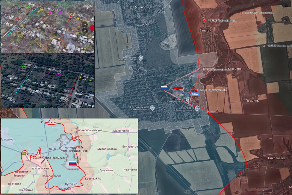 03.11.25 Красноармейск - Динасовый посёлок Активные боевые действия в Красноармейске. Боевое подразделение ВС РФ продвигается в жилом секторе района Динасовый посёлок к новым позициям. ВС РФ увеличили зону контроля на 1 км и продвинулись к многоэтажной застройке на востоке города. https://t.me/Warhronika/10308