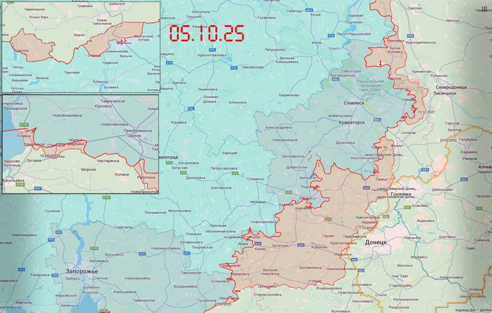 05.10.25 Сводка. Боевые действия с 01 по 04 октября 2025 года. В Харьковской зоне безопасности ВС РФ продвинулись в Волчанске южнее реки и заняли новые позиции на железнодорожной станции. На Краснолиманском направлении ВС РФ расширили зону контроля по рубежу Колодези - Дерилово. В районе Северска Вооруженными Силами РФ занят населённый пункт Федоровка, ведутся боевые действия в Выемке и на южных подступах к Северску. В районе Горловки расширен контроль ВС РФ трассы на Константиновку южнее Нелеповки. На Добропольском выступе ВС РФ продвинулись севернее Золотого Колодезя. Продолжаются встречные бои около Дорожного. Имеется некоторое продвижение ВС РФ на восточной окраине Красного Лимана. На южном охвате Красноармейска ВС РФ занята новая позиция в Чунишино. Около Великой Новосёлки ВС РФ возобновили боевые действия за контроль плацдарма по рубежу Искра - Александроград. В Днепропетровской зоне безопасности штурмовые отряды ВС РФ зашли в Степовое и заняли новые позиции. В районе Гуляйполя ВС РФ атаковали позиции ВСУ в направлении Полтавки и продвинулись до восточной окраины населённого пункта. В Степногорске расширена зона контроля ВС РФ в частном секторе посёлка.