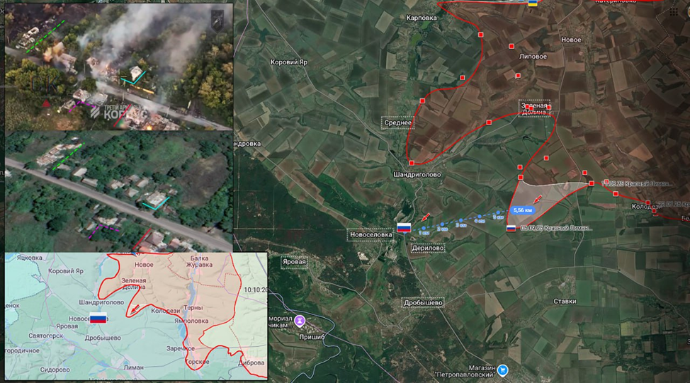 06.09.25 Красный Лиман – Шандриголово. Активные боевые действия в районе Красного Лимана. Атака ВСУ бронетехникой в населённом пункте Шандриголово. Огневой налёт на позиции ВС РФ в южной части жилой застройки. Продвижение ВС РФ более 5 км, выход на новый рубеж по реке Нитриус.