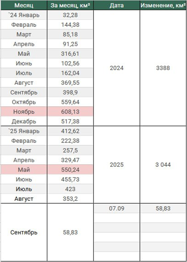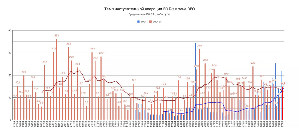 07.09.25 Темп наступления. Среднесуточное продвижение ВС РФ в зоне проведения СВО. Обновление по данным c 3 по 6 сентября 2025. Темп продвижения +14,7 км² в сутки за период, общее продвижение 58,83 км².