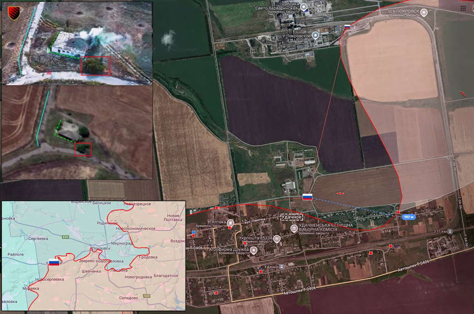 09.10.25 Красноармейск – Удачное. Активные боевые действия в районе Красноармейска. Атака ВС РФ пехотным подразделением на южном охвате Красноармейска. Штурмовая группа занимает новые позиции в сельскохозяйственных постройках севернее Удачного. Расширение зоны контроля до 1 км на рубеже Удачное - шахта "Красноармейская-Западная №1"
