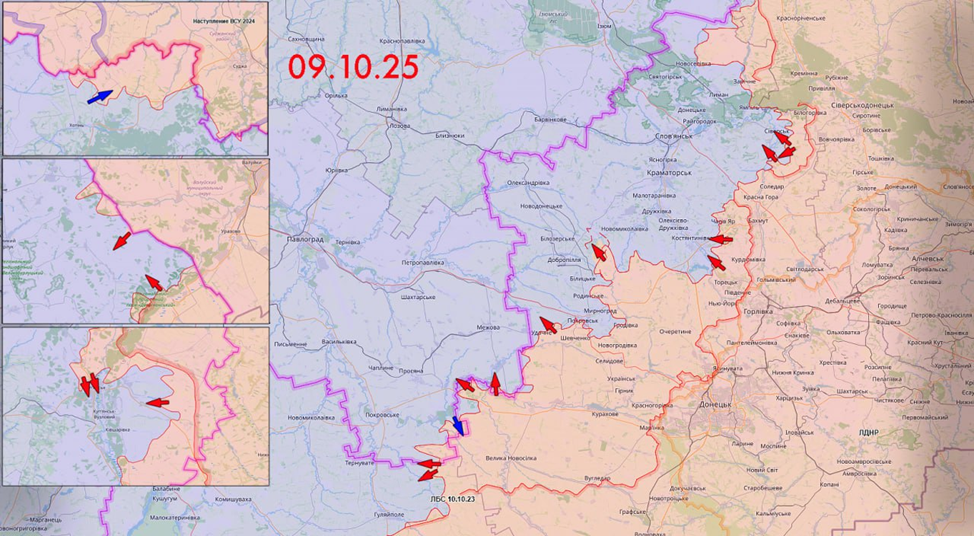 09.10.25 Сводка. Боевые действия с 05 по 08 октября 2025 года. В Сумской зоне безопасности ВСУ атаковали позиции ВС РФ на окраинах Алексеевки. В Харьковской зоне безопасности в Отрадном поднят флаг Российской Федерации и заняты новые позиции в Каменке. В Купянске ВС РФ продвинулись в жилой застройке к железнодорожной станции и около центральной площади. На левобережном плацдарме восточнее Купянска ВС РФ заняли новые позиции севернее Песчаного. В районе Северска ВС РФ вышли на позиции вдоль железной дороги к городу, завязали боевые действия в опорном пункте на южных подступах к Северску, а также взяли под контроль жилую застройку в Кузьминовке. Около Константиновки штурмовые отряды достигли Предтечино и вышли на западную окраину населённого пункта. ВС РФ занят опорный пункт около Иванополья. На Добропольском выступе продолжаются боевые действия за контроль территорий около Золотого Колодезя, занято Вольное. На южном охвате Красноармейка ВС РФ начали штурмовые действия в производственных помещений шахты “Красноармейская-Западная №1”. В районе Великой Новосёлки ВС РФ вернули себе позиции западнее Зелёного Гая. В Днепропетровской зоне безопасности ВС РФ продвинулись севернее Филии вдоль реки Солёная. Уточнена зона контроля ВСУ в Январском. Около Гуляйполя ВС РФ подняли флаги в населенных пунктах Нововасильевское и Новогригоровка. Ведутся боевые действия около Новониколаевки.