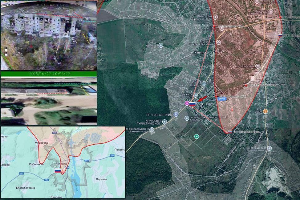22.10.25 Купянск – Юбилейный. Позиционные боевые действия в Купянске. Увеличена зона контроля ВС РФ в районе многоэтажной застройки Юбилейный на 400 метров. Передовая позиция ВС РФ в жилом доме обстреляна ВСУ.