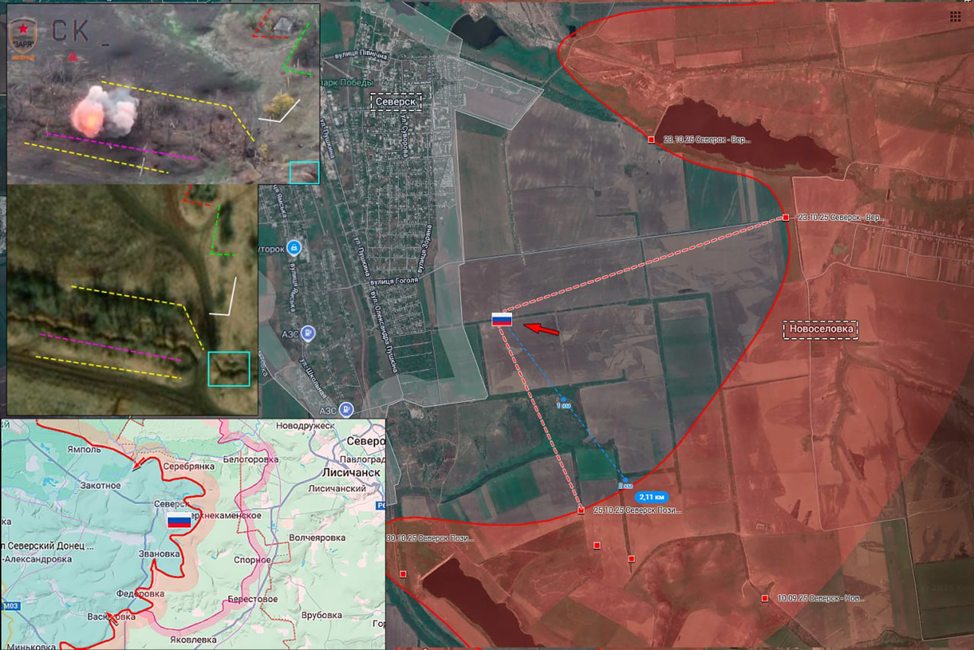 09.11.25 Северск. Активные боевые действия в районе Северска. Атака ВС РФ пехотным подразделениям. Штурмовик зачищает блиндаж ВСУ в крупном опорном пункте восточнее города. ВС РФ продвинулись на 2 км и заняли новые позиции на ближних подступах к Северску. https://t.me/zarya_1msb/108