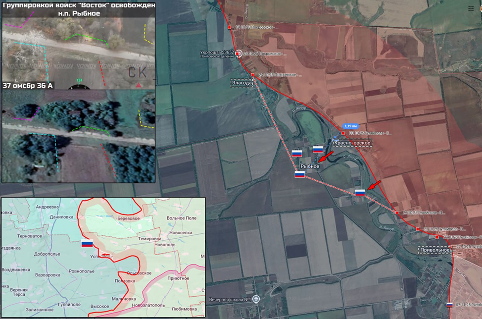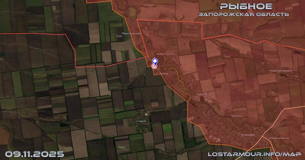 09.11.25 Гуляйполе – Рыбное. Последствия боевых действий в районе Гуляйполя. ВС РФ вышли на рубежи западнее реки Янчур и взяли под контроль новые позиции в населённом пункте Рыбное. В Рыбном подняты флаги Российской Федерации. Продвижение ВС РФ более 1 км в западном направлении. https://t.me/voin_dv/17613