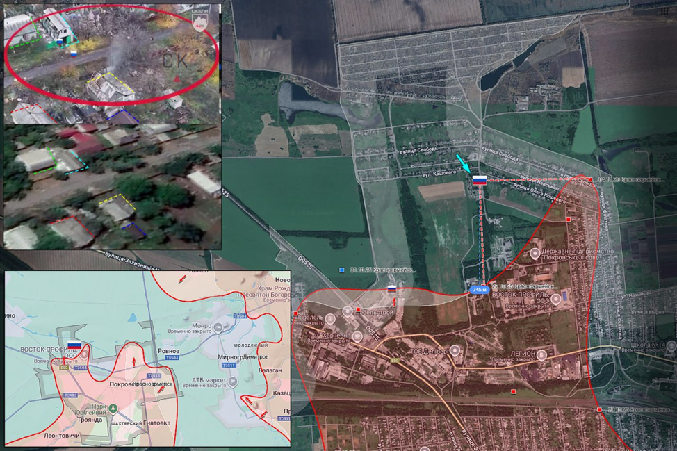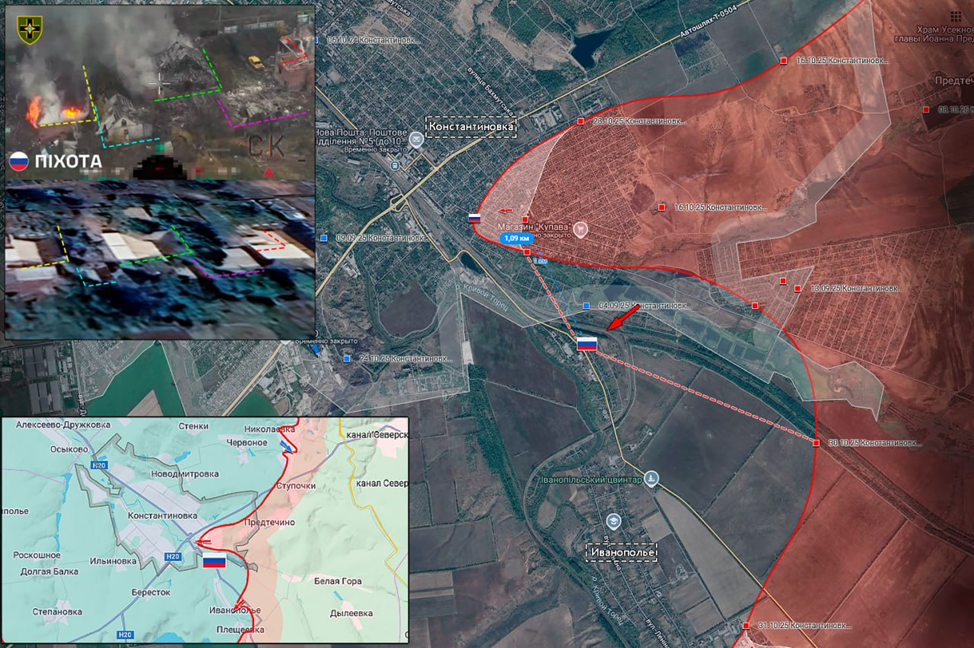 12.11.25 Константиновка – Иванополье. Штурм Константиновки. ВС РФ продвинулись в предместьях Константиновки более 1 км и заняли новые позиции в северной части Иванополья. Передовая позиция ВС РФ в жилой застройке на севере посёлка под обстрелом ВСУ.