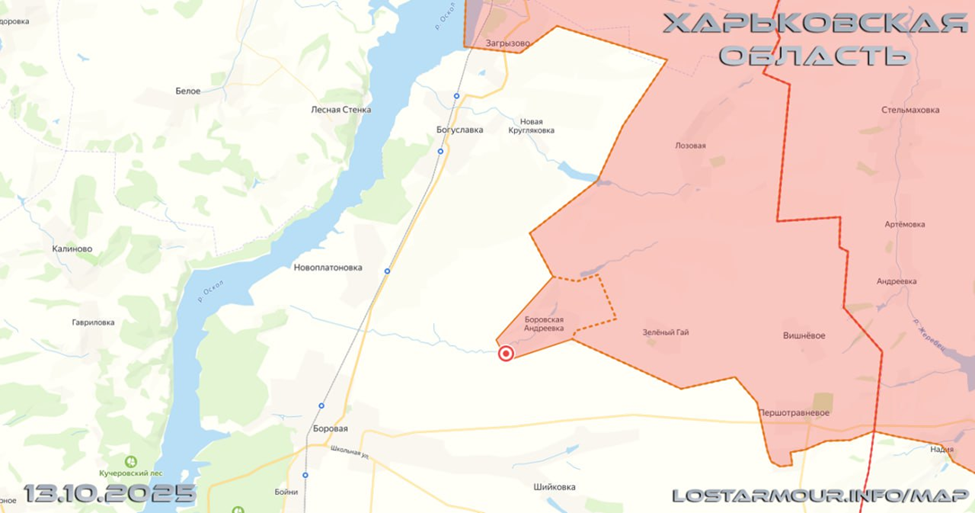 13.10.25 Сводка. Боевые действия с 09 по 12 октября 2025 года. Около Купянска ВСУ расширили зону контроля севернее города продвинувшись к Радьковке с западного направления. В районе Боровой ВС РФ вернули утраченные ранее позиции в Загрызово с выходом в южную часть населённого пункта. На Краснолиманском направлении ВС РФ продолжили боевые действия в Ямполе и заняли часть жилой застройки продвигаясь в центру посёлка. На восточном охвате Красноармейска ВС РФ провели ряд массированных штурмов в направлении Владимировки деблокируя позиции в основании Добропольского выступа. Продолжились наступательные действия в направлении Димитрова с востока города - занят населённый пункт Балаган и с севера - расширена зона контроля на подступах к городу. Продолжается продвижение ВС РФ в восточной части Родинского: занята новая позиция в многоэтажной застройке. На южном охвате Красноармейска под контроль ВС РФ перешел комплекс сельскохозяйственных построек около Удачного. В районе Великой Новосёлки ВС РФ заняли позиции севернее Александрограда выравнивая линию фронта по реке Волчья. В Днепропетровской зоне безопасности ВС РФ штурмом взяли населённый пункт Алексеевка, закрепившись в значительной части жилой застройки. В районе Гуляйполя ВС РФ ведут боевые действия в Полтавке продвигаясь вдоль восточного берега реки Янчур в северном направлении.