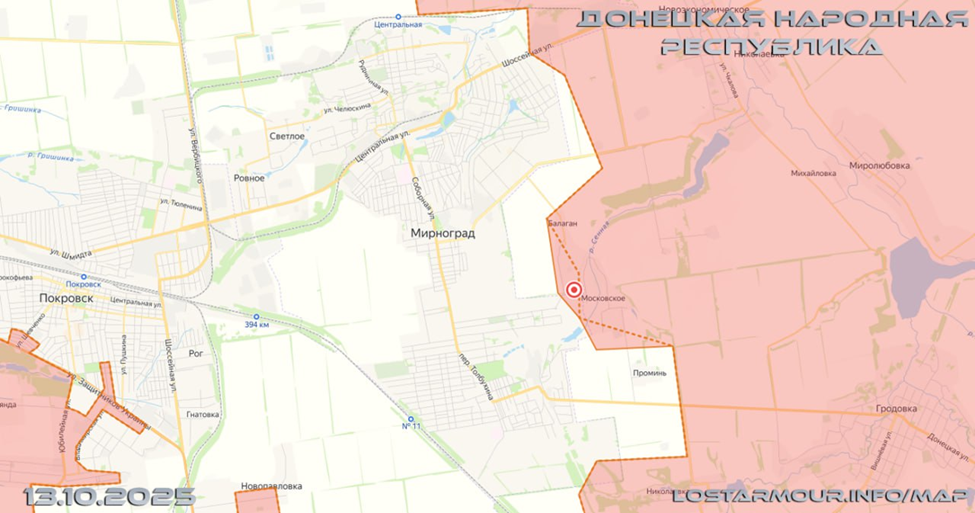 13.10.25 Красноармейск - Котляровка Позиционные боевые действия в районе Красноармейска. ВС РФ увеличили контролируемые территории на южном охвате Красноармейска и продвинулись к границе с Днепропетровской областью на 2 км западнее Котляровки. Военнослужащий ВС РФ попал под обстрел ВСУ.