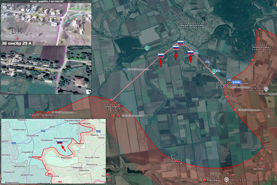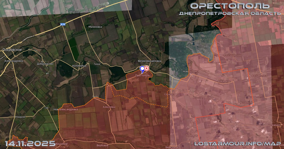 14.11.25 Покровское – Орестополь. Последствия боевых действий в Днепропетровской зоне безопасности. ВС РФ заняли населённый пункт Орестополь и вышли на новые рубежи по реке Волчья. Продвижение в Днепропетровской области на 4 км. В Орестополе развернуты флаги Российской Федерации. https://t.me/voin_dv/17680