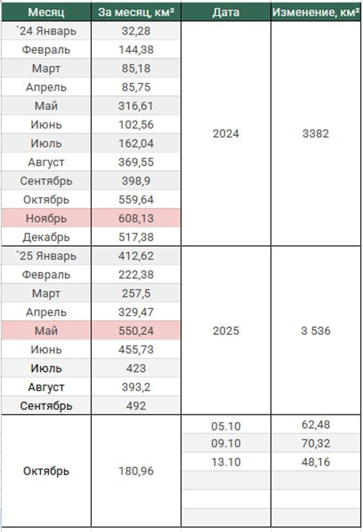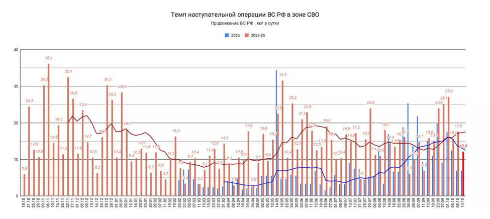 13.10.25 Темп наступления Среднесуточное продвижение ВС РФ в зоне проведения СВО. Обновление по данным c 09 по 12 октября 2025. Темп продвижения +12,0 км² в сутки за период, общее продвижение 48,16 км².