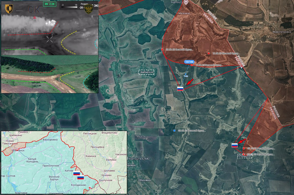 18.10.25 Великий Бурлук – Отрадное. Позиционные боевые действия в Харьковской зоне безопасности. ВС РФ заняли ряд новых позиций в окрестностях Амбарного и на окраинах Отрадного, с продвижением более 1.5 км в глубину обороны ВСУ. Передовые позиции ВС РФ обстреляны ВСУ.