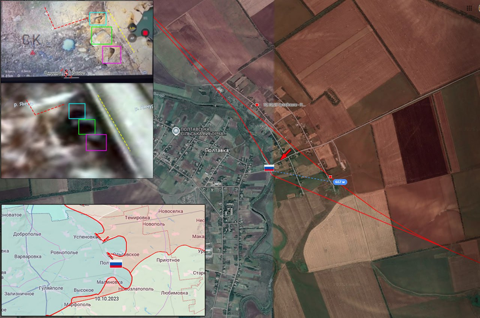 18.10.25 Гуляйполе – Полтавка. Активные боевые действия в районе Гуляйполя. Штурмовики ВС РФ занимают позиции на разрушенном мосту через реку Янчур в Полтавке. Продвижение ВС РФ более 600 метров, выход на рубеж по руслу реки.