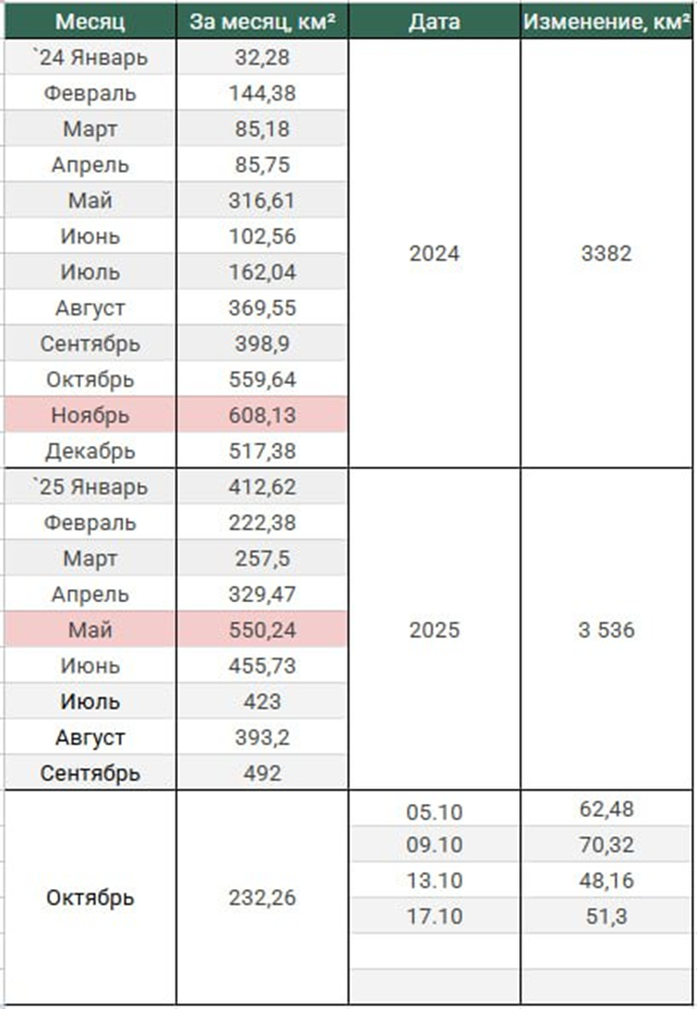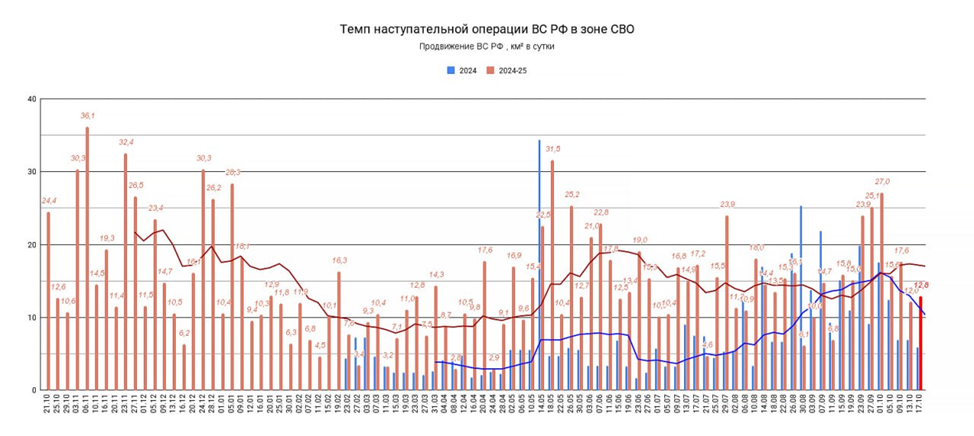 17.10.25 Темп наступления. Среднесуточное продвижение ВС РФ в зоне проведения СВО. Обновление по данным c 13 по 16 октября 2025. Темп продвижения +12,8 км² в сутки за период, общее продвижение 51,3 км².