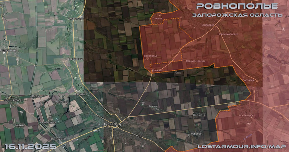 16.11.25 Гуляйполе - Равнополье. Последствия боевых действия в районе Гуляйполя. В населённом пункте Равнополье подняты флаги Российской Федерации. Посёлок перешел под уверенный контроль Вооруженных Сил РФ. Продвижение ВС РФ в Запорожской области до 2 км на северном флаге Гуляйпольского направления. https://t.me/voin_dv/17704