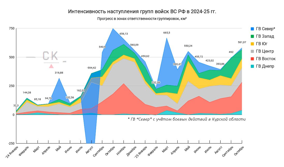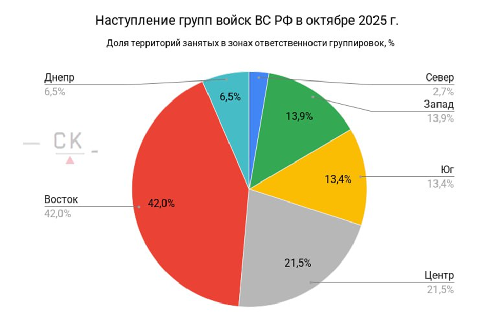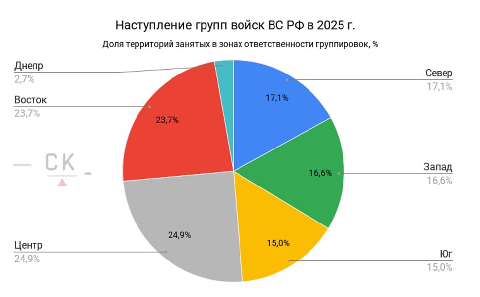 15.11.25 Группировки войск ВС РФ. Интенсивность наступления ВС РФ в зонах ответственности групп войск в 2023-25 годах. Представлено процентное соотношение вклада каждой группировки в общее продвижение за период. *Данные по группе войск “Север” даны с учётом боевых действий в Курской области.