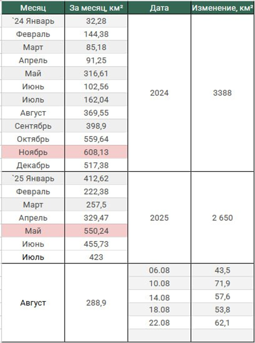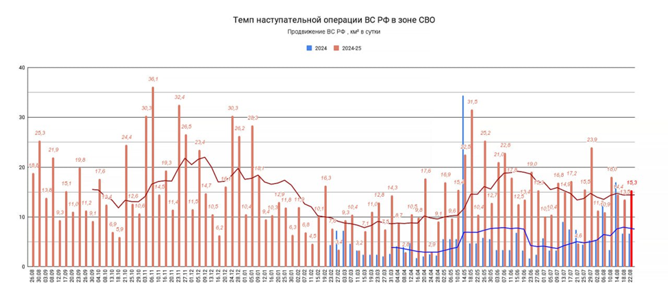 22.08.25 Темп наступления Среднесуточное продвижение ВС РФ в зоне проведения СВО. Обновление по данным c 18 по 21 августа 2025. Темп продвижения +15,3 км² в сутки за период, общее продвижение 62,1 км².