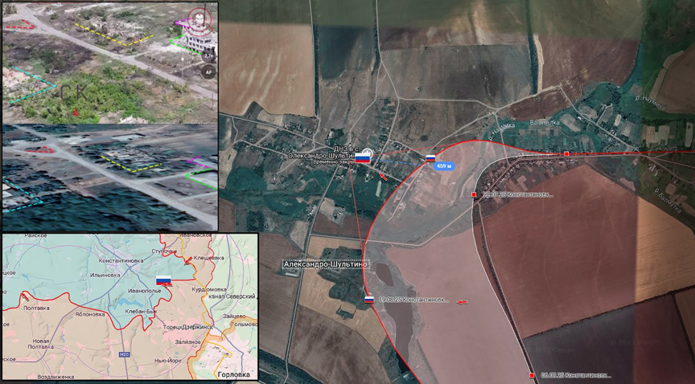 23.08.25 Константиновка - Александро-Шультино Активные боевые действия в районе Горловки. Атака ВС РФ пехотным подразделениtм в Александро-Шультино. Штурмовая группа занимает новые позиции в центре посёлка. Продвижение ВС РФ до 500 метров в направлении Константиновки. https://t.me/Legion_W_Bat1/970