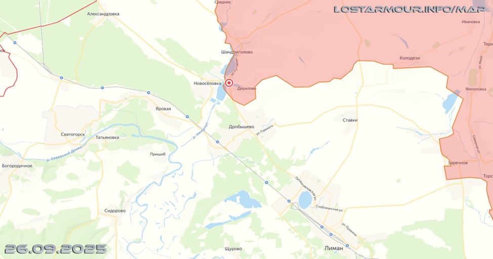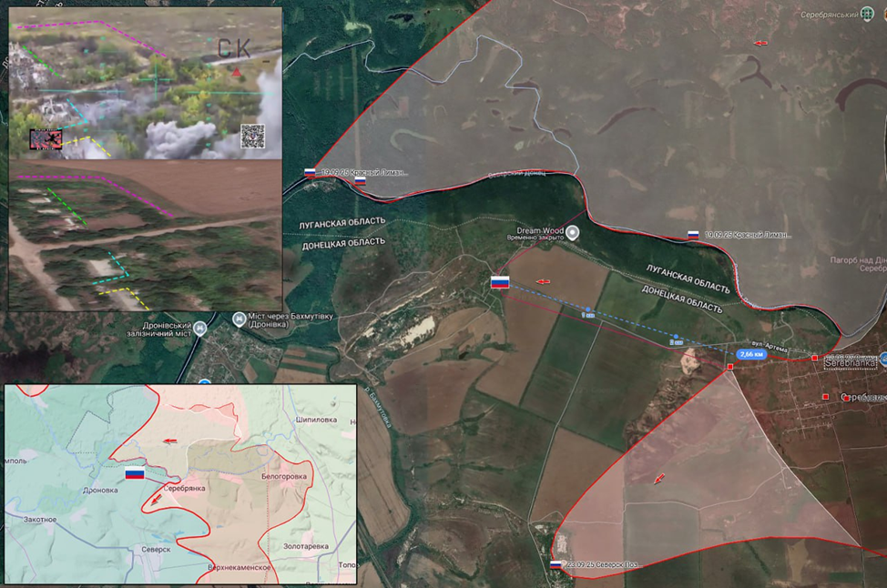 26.09.25 Северск – Рудник. Позиционные боевые действия в районе Северска. ВС РФ продвинулись более 2 км вдоль южного берега реки Северский Донец и заняли новые позиция в зданиях на Руднике. Передовая позиция ВС РФ обстреляна с дрона ВСУ.
