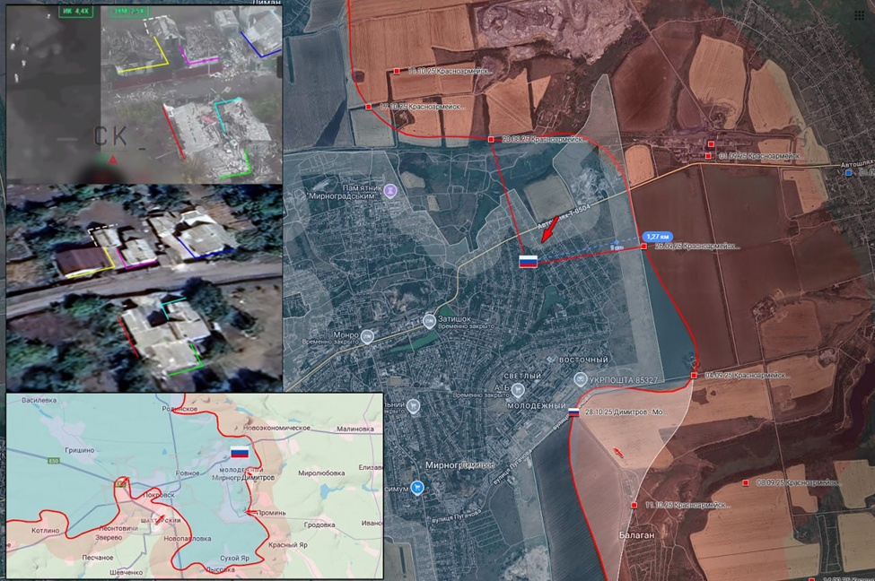 29.10.25 Димитров - 8-й посёлок Активные боевые действия в районе Красноармейска. Атака ВС РФ пехотным подразделением в жилой застройке Димитрова. Штурмовая группа занимает новые позиции в частном секторе района 8-й посёлок. Продвижение ВС РФ 1,5 км в Димитрове с восточного направления.