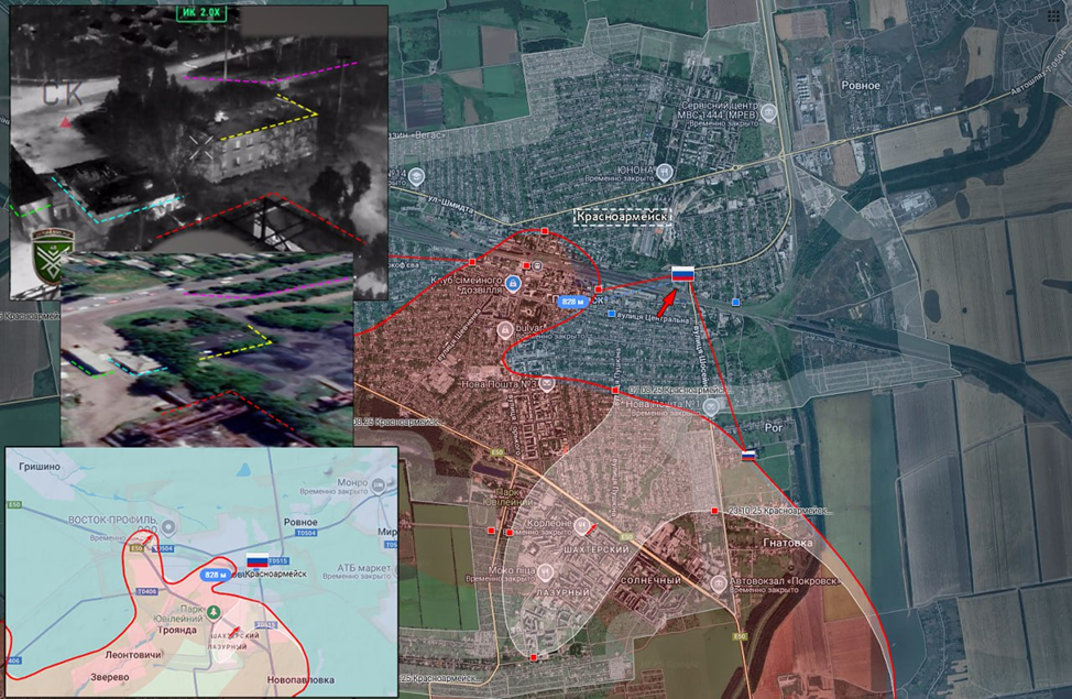 28.10.25 Красноармейск - Караковский посёлок Позиционные боевые действия в Красноармейске. ВС РФ продвинулись севернее железной дороги и заняли новые позиции в промзоне рядом в Караковским посёлком. Увеличение зоны контроля 800 метров. Передовая позиция в промышленном здании попала под обстрел ВСУ.