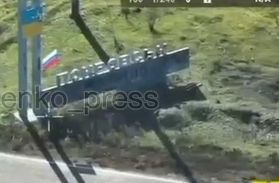 Российский флаг на стеле около въезда в город Красноармейск, где когда-то позировал Зеленский. https://t.me/lost_armour/6914