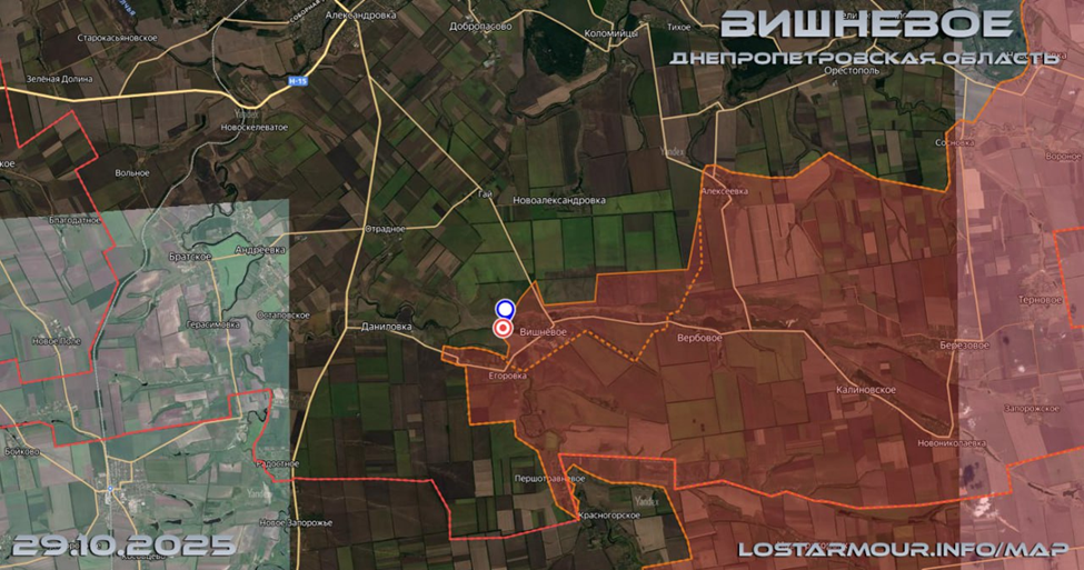 29.10.25 Покровское - Вишневое Последствия боевых действий в Днепропетровской зоне безопасности. Штурмовые подразделения ВС РФ берут под полный контроль населённый пункте Вишнёвое и поднимают флаги Российской Федерации по всей территории посёлка. Продвижение ВС РФ в Днепропетровской области 2 км вдоль реки Янчур. https://t.me/voin_dv/17448