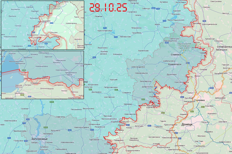 29.10.25 Сводка. Боевые действия с 25 по 28 октября 2025 года. На Купянском направлении ВС РФ увеличили зону контроля по западному берегу реки Оскол заняв новые позиции на рубеже Красное 1-е - Фиголевка. Около Красного Лимана ВС РФ вышли с севера к населённому пункту Новосёловка. В районе Северска под контроль ВС РФ перешла жилая застройка Дроновки рядом с железнодорожным мостом через Северский Донец и отмечена атакующая активность ВС РФ около шахты №6. Имеется продвижение к Северску с южного направления. В Константиновке ВС РФ продолжили продвижение в частном секторе района Сантуриновка и провели механизированную атаку к северу от Русина Яра. На Добропольском выступе продолжаются встречные бои. ВС РФ взяли под контроль северную часть Октябрьского, ВСУ атаковали позиции ВС РФ в Сухецком и в садоводствах рядом с Вольным. В Димитрове ВС РФ занимают ряд новых позиций по восточным окраином города. В Красноармейске ВС РФ достигли промзоны рядом с 8-й группой в западной части города и вышли в жилую застройку населённого пункта Рог. На южном охвате Красноармейка ВС РФ штурмовали опорный в окрестностях Новосергеевки. В Днепропетровской зоне безопасности увеличен контроль жилой застройки Ивановки, район Межевой. Около Покровского подняты флаги Российской Федерации в Егоровке, Приволье и Новониколаевке. Так же ВС РФ провели мотострелковой группой атаку около Сосновки. В районе Каменского ВС РФ малыми пехотными группами продолжили продвижение вдоль старого берега Каховского водохранилища в Приморском