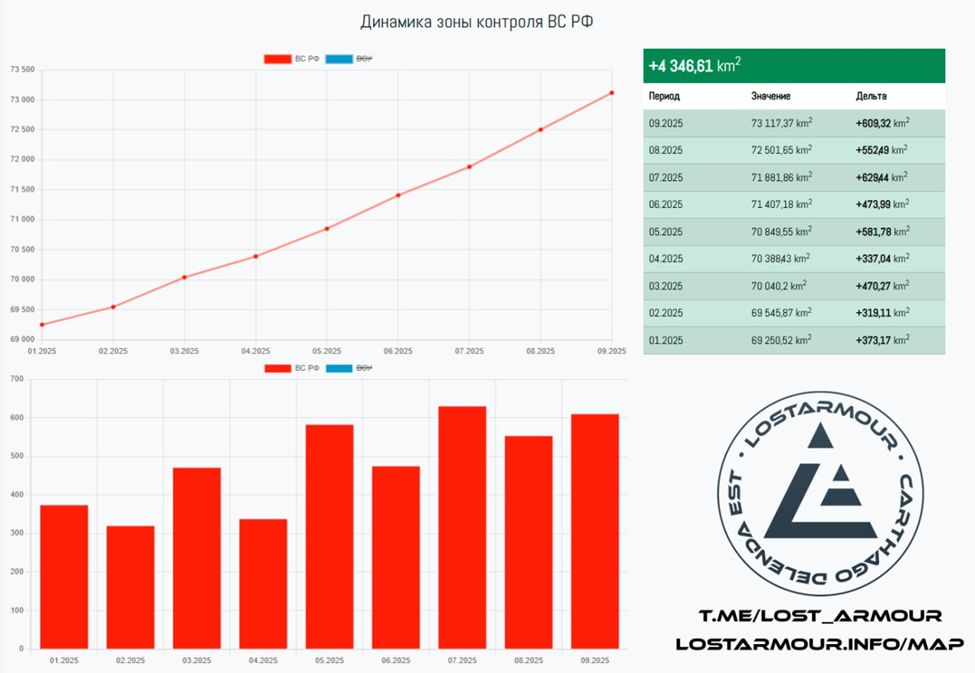 Вооруженные силы Российской Федерации в сентябре 2025 года освободили свыше 609 км² территории в зоне СВО. Инфографика по данным картографического сервиса https://lostarmour.info/map