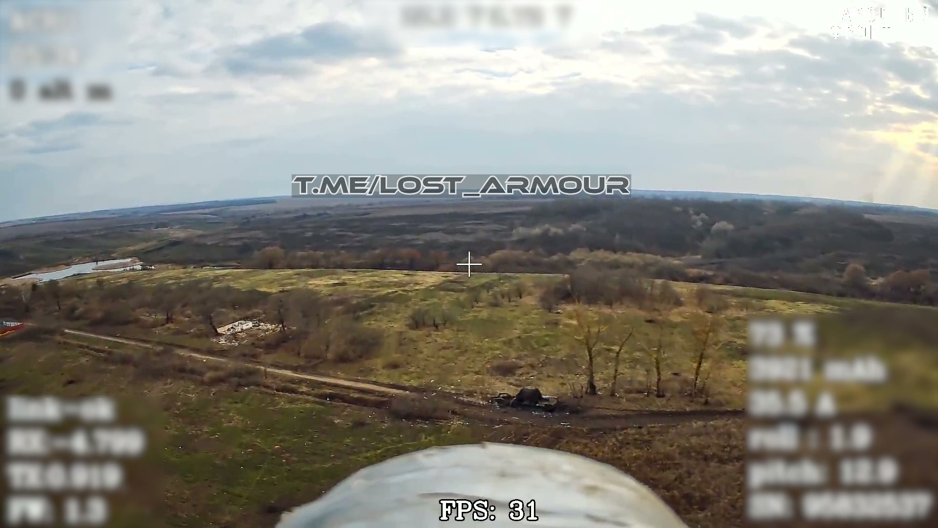 видео пролет оптоволоконного дрона "КВН" над очередной уничтоженной колонной бронетехники ВСУ в окрестностях Суджи, https://t.me/lost_armour/4889