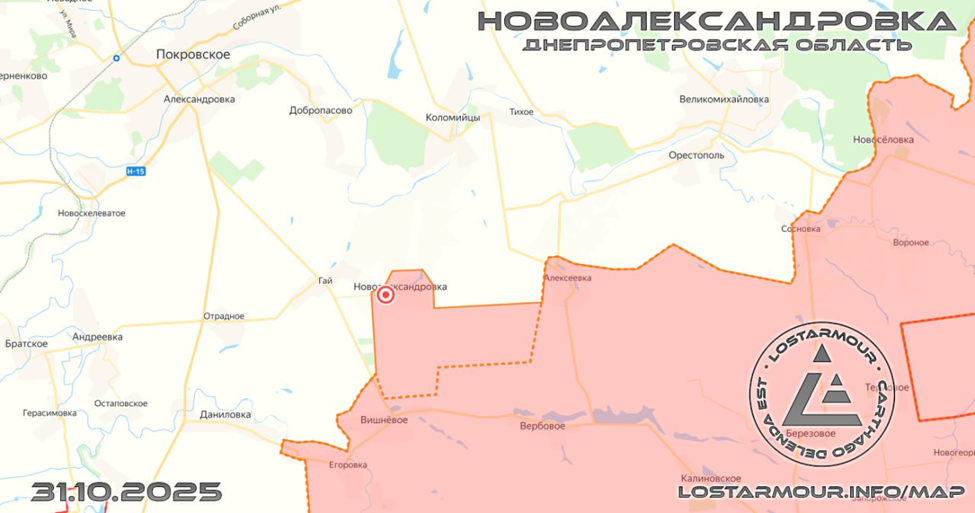 31.10.25 Покровское - Новоалександровка Последствия боевых действий в Днепропетровской зоне безопасности. Под уверенный контроль ВС РФ перешел населённый пункт Новоалександровка в Днепропетровской области. В жилой застройке подняты флаги Российской Федерации. Продвижение ВС РФ до 4 км в направлении к Покровскому. https://t.me/voin_dv/17481