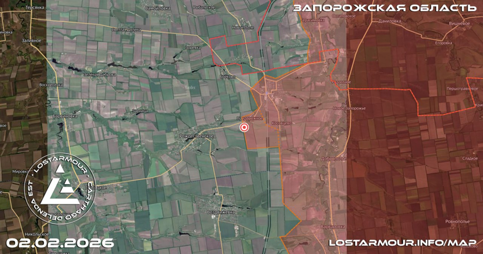 02.02.26 Гуляйполе - Придорожное Последствия боевых действий в районе Гуляйполя. В результате продвижения в Запорожской области под контроль ВС РФ перешел населённый пункт Придорожное. В жилой застройке развёрнуты флаги Российской Федерации. Увеличение зоны контроля ВС РФ 2 км севернее Гуляйполя. https://t.me/voin_dv/18543