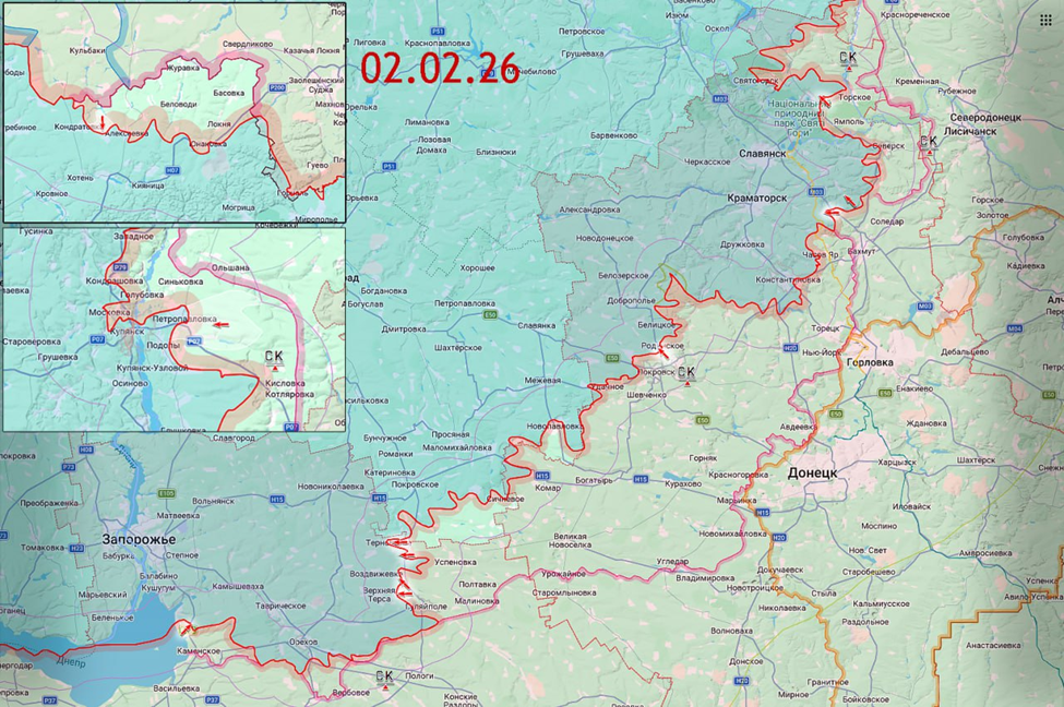 02.02.26 Сводка. Боевые действия с 29 января по 01 февраля 2026 года. В Сумской зоне безопасности ВС вышли на северные окраины Андреевки. На Купянском направлении штурмовым подразделениям ВС РФ удалось овладеть центром населённого пункта Петропавловка и занять новые позиции в Подолах. Около Красного Лимана ВС РФ усилили своё положение на восточных подступах к городу. На северном фланге Артёмовского направления ВС РФ продвинулись на запад и достигли жилой застройки населённого пункта Миньковка. Около Красноармейска ВС РФ взяли под контроль южную часть Родинского. В районе Гуляйполя развёрнуты флаги ВС РФ в Терноватом и Петровке, заняты новые позиции по западному берегу реки Гайчур рядом с Добропольем, ведутся бои за контроль западных окраин Жовтневого. В окрестностях Степногорска ВС РФ продвинулись вдоль трассы на Запорожье и заняли новые позиции в Лукьяновском. Карта https://goo.gl/maps/4eum5C9giNDebgXf7