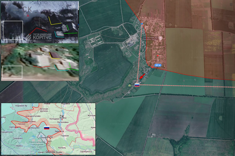 03.02.26 Красный Лиман – Ставки. Позиционные боевые действия в районе Красного Лимана. Передовая позиция ВС РФ в жилой застройке Ставков под огнём ВСУ. ВС РФ продвинулись в границах населённого пункта и заняли новые позиции в южной части.