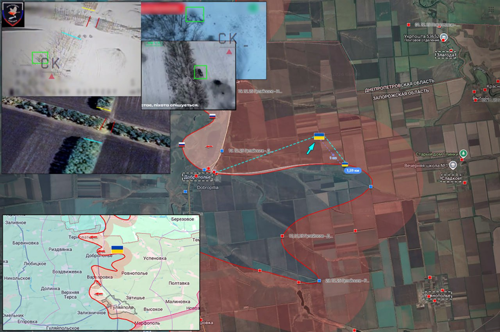 02.02.26 Гуляйполе – Доброполье. Активные боевые действия в районе Гуляйполя. Атака ВСУ пехотным подразделением. Штурмовая группа занимает позиции под огнём ВС РФ. Увеличение зоны контроля ВСУ на линии Доброполье - Сладкое на 1.5 км. В кадре виден уничтоженный в ходе атаки ВС РФ за 24 января 2026 штурмовой Урал ВС РФ https://t.me/baykalkaspiy/397