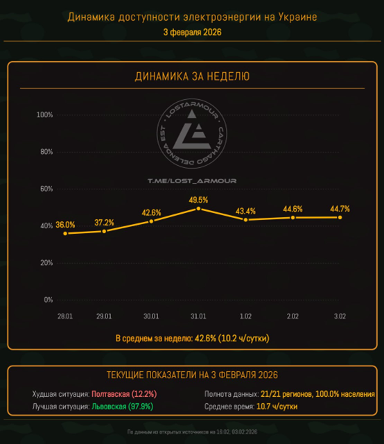 Инфографика доступности электроэнергии на территории Украины по областям на 3 февраля 2026. • Среднее время доступности электроэнергии за сутки - 10,7 часов (44,7%) https://t.me/lost_armour/8028