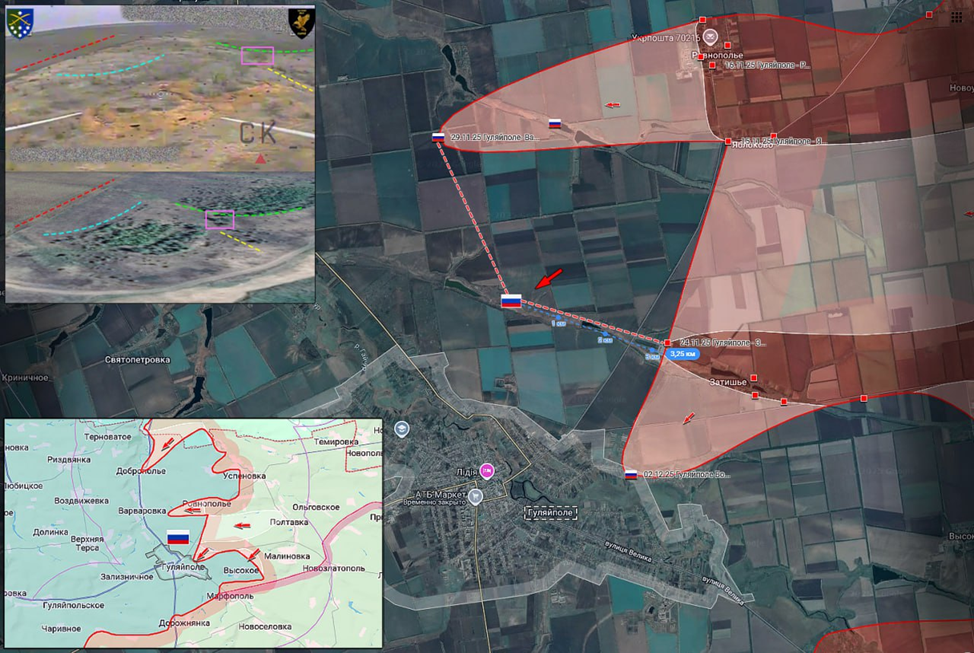 02.12.25 Гуляйполе. Позиционные боевые действия в районе Гуляйполя. ВС РФ продвинулись более 5 км на северном охвате Гуляйполя и заняли новые позиции в опорном пункте. Передовая позиция попала под огонь ВСУ.