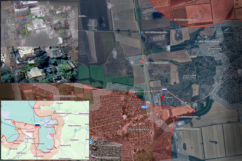 01.12.25 Красноармейск – Ровное. Активные боевые действия в районе Красноармейска. Атака ВС РФ пехотным подразделением в Ровном. Штурмовики ВС РФ занимают новые позиции в жилой застройке. ВС РФ увеличивают зону контроля в горловине Красноармейского мешка, беря под контроль жилую застройку в Ровном.